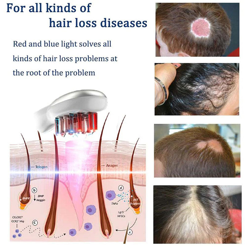 Red light stimulates hair follicles and increases blood circulation, while blue light helps combat dandruff and promote a healthy scalp environment.