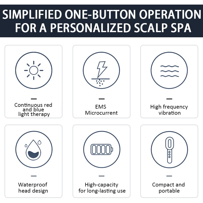 These high-frequency vibrations stimulate blood circulation, trigger secondary muscle movements, revitalize hair follicles, and promote cell regeneration by gently delivering electrical waves from the epidermal layer directly to the dermal layer during scalp massage.
