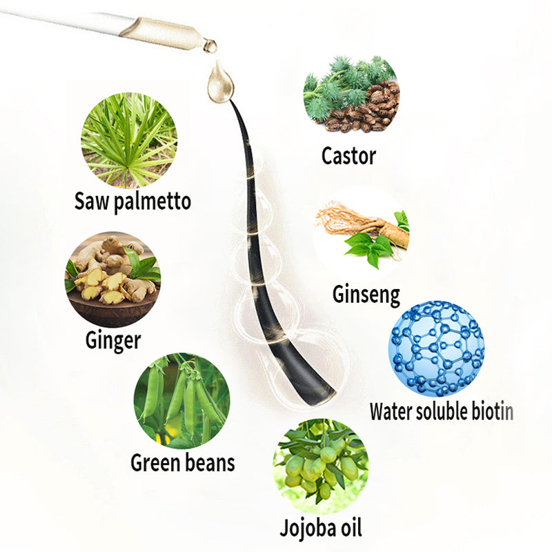 "Saw palmetto inhibits DHT, Ginger stimulates circulation, Green beans supply essential nutrients, Castor bean strengthens hair, Ginseng revitalizes, Water soluble biotin supports growth, and Jojoba oil moisturizes. This product is a breakthrough for people seeking natural, effective hair growth."