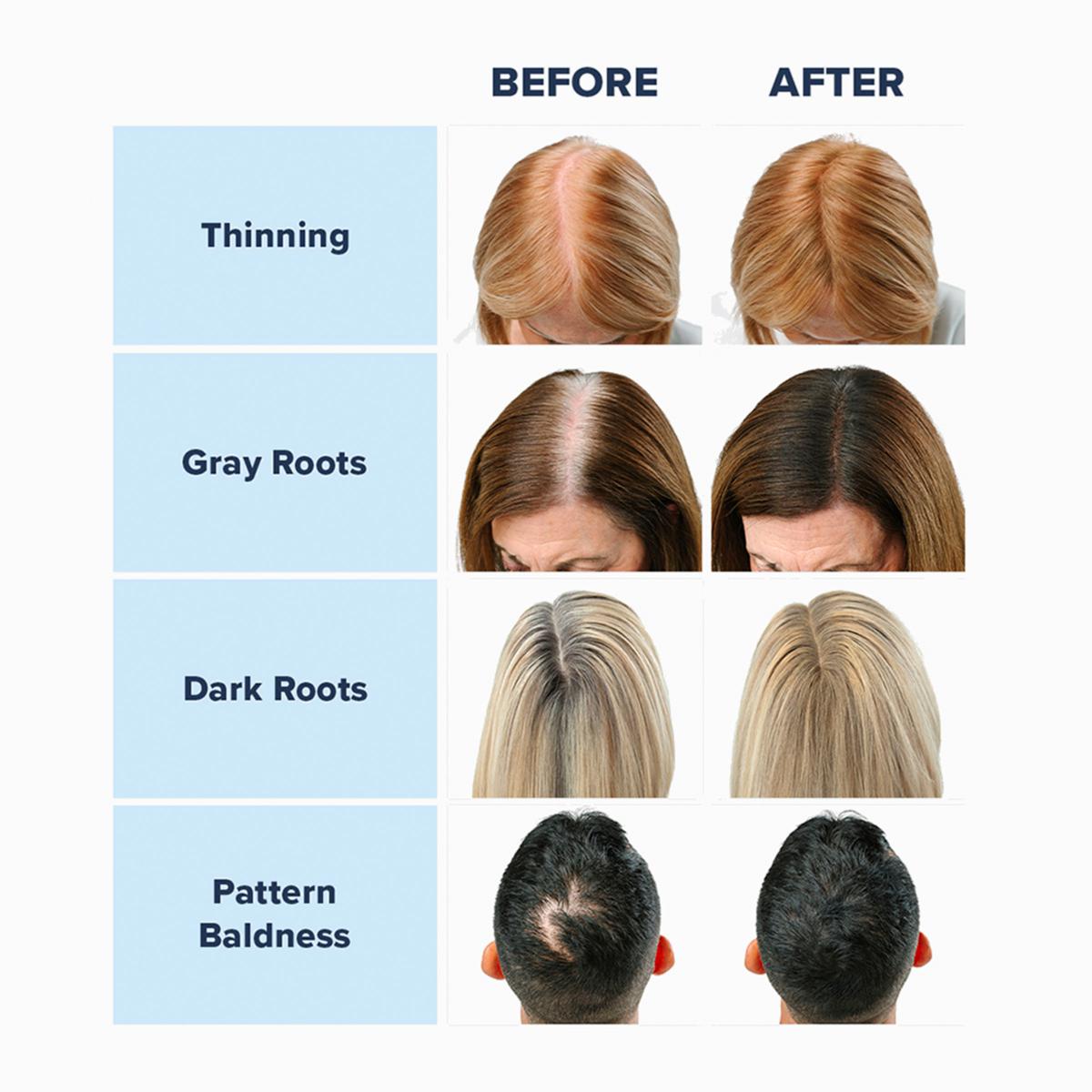 - Helps cover gray and grown-in roots, while also adhering to scalp to disguise thinning hair spots